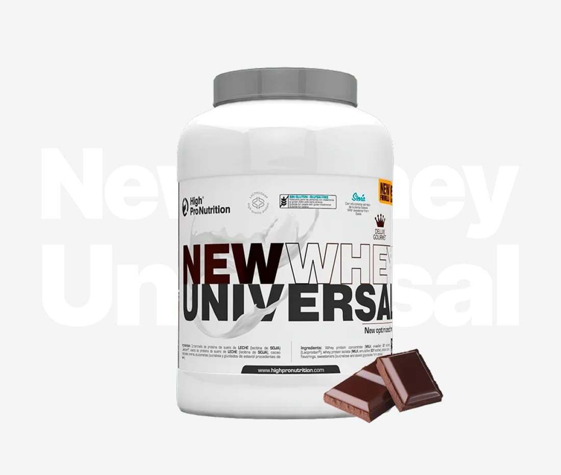Cantidad diaria recomendada La dosis diaria recomendada es de 30 g, que corresponde a una medida del dosificador incluido en el envase. Optimiza tus entrenamientos con New Whey Universal Gourmet Con New Whey Universal Gourmet, cuidar tu alimentación y alcanzar tus metas nunca había sido tan delicioso. Gracias a su fórmula avanzada y sabores irresistibles, es el complemento perfecto para deportistas, personas activas y cualquier adulto que desee mejorar su bienestar. Chocolate Nuevo sabor Ingredientes Concentrado de proteína de suero de LECHE (lecitina de SOJA) (Lacprodan®), aislado de proteína de suero de LECHE (lecitina de SOJA), cacao desgrasado, aromas, edulcorantes (sucralosa y glucósidos de esteviol procedentes de stevia).